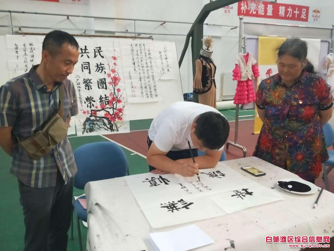 活动现场通过图文展板、非遗作品展示、节目表演、知识抢答发放宣传资料等方式,展示近年来非遗保护的基本情况,让大家了解我区在非物质文化遗产挖掘工作、传承人保护等方面取得的成果,让群众充分感受了我国非物质文化遗产的独特魅力、传承人的非凡创造力以及乡土源远流长、灿烂厚重的历史文化底蕴。此外,还邀请了曲艺、书法、剪纸、斗鸡、阿肯弹唱的传承人进行现场表演。特别是北坡社区的斗鸡那是一项绝活,引得大家驻足观看,150余名围观群众直呼叫好,现场欢声笑语一片,白碱滩区本土书法家崔年友与北坡社区志愿者姜志学更是为居民书法献艺,文笔有神,那真的是艺术来源于民间。
