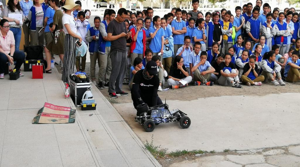 首先进行的是科技作品展示活动,青少年科技活动中心的老师们,向第十中学的同学们展示了不同类型的航模、车模等作品,并展示了他们高超的操控技艺。活动过程中,老师们精彩的展示表演,引起同学们阵阵惊呼,同学们毫不吝啬地将最热烈的掌声送给了表演的老师们。随后青少年活动中心的老师们邀请了6名第十中学的同学,参与体验车模的操控。