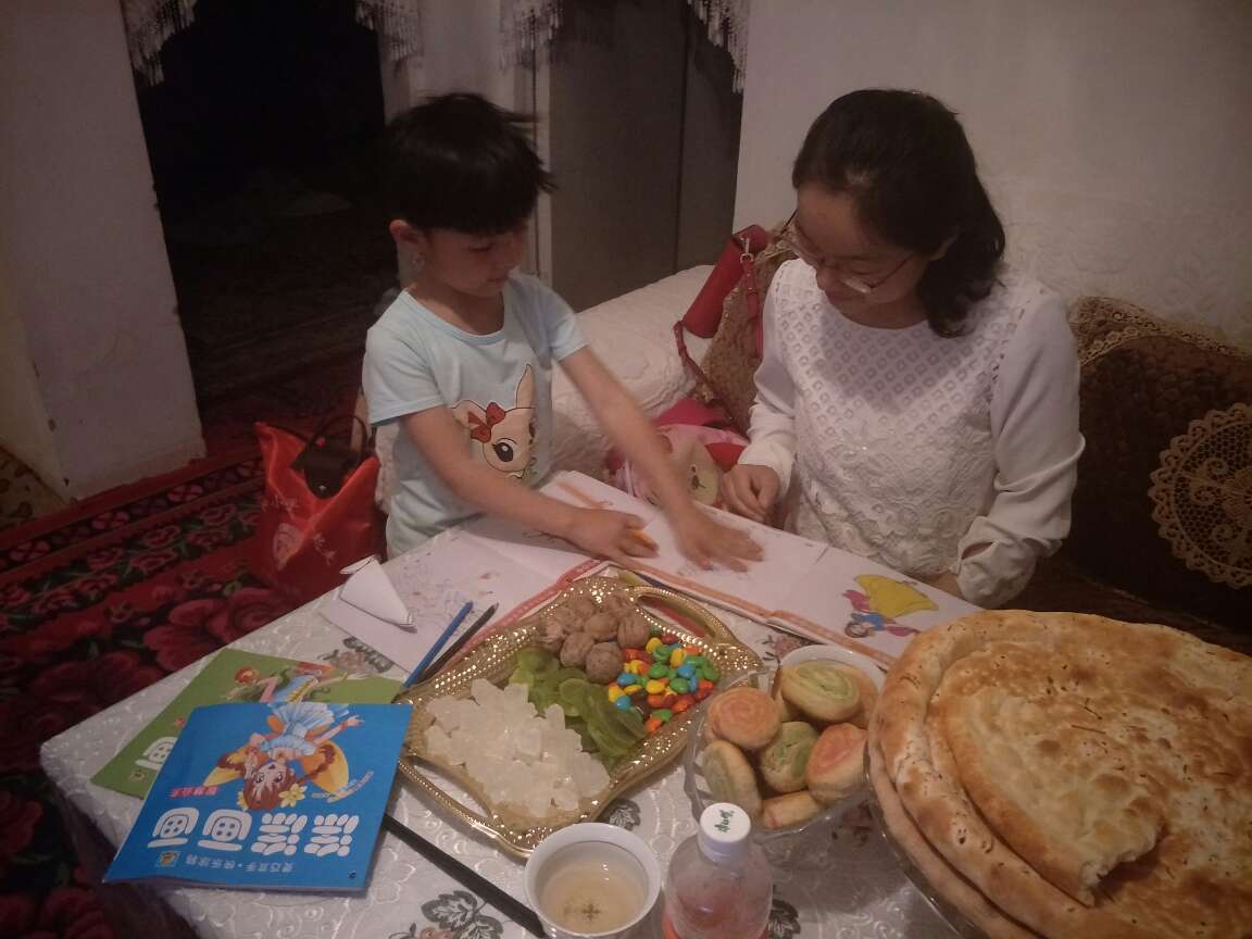 “阿姨,这个彩色的巧克力我很喜欢送给你吃”、“阿姨,我们一起给这个漂亮的公主图上颜色”……几次见面后,王靖鑫与阿依努尔家六岁的小姑娘麦合丽娜建立了融洽的关系:麦合丽娜会认真挑选盘里五彩巧克力糖、会把自己认为最好吃的零食给家中这位新的亲戚阿姨,还会拿出彩笔和图画让阿姨陪她画画,受这种气氛的影响,家里未满周岁的小朋友也会不时让王靖鑫抱抱。在彼此的走动、沟通中,阿依努尔家每一位成员都以自己的方式欢迎着王靖鑫,她们的质朴善良、她们的热情让彼此之间的感情逐渐升华。