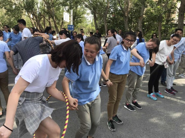 首先,开展了热身活动,由学生和结亲对象为一组,开展了你来比划我来猜项目。有的组合心有灵犀、配合默契,一组“民族团结一家亲”的谜底,学生指了指自己和结亲对象,答题者便瞬间悟到答案,赢得了在座师生的阵阵掌声。而有的选手因不知如何表达急的不知所措、手舞足蹈,答题者也急得满头大汗,答出来的谜底千奇百怪,引得大家捧腹大笑。参赛组合急,台下观战、等待上场的孩子们更急,一个个一边加油呐喊一边商量对策。随后,又进行了运篮球接力跑和巧转呼啦圈活动。