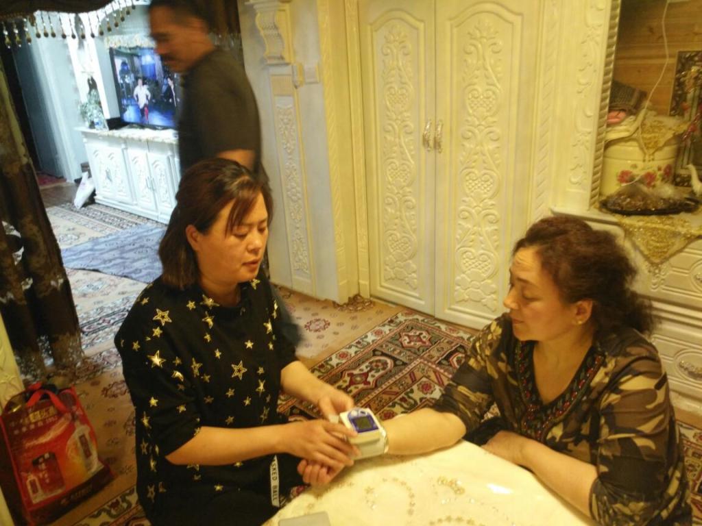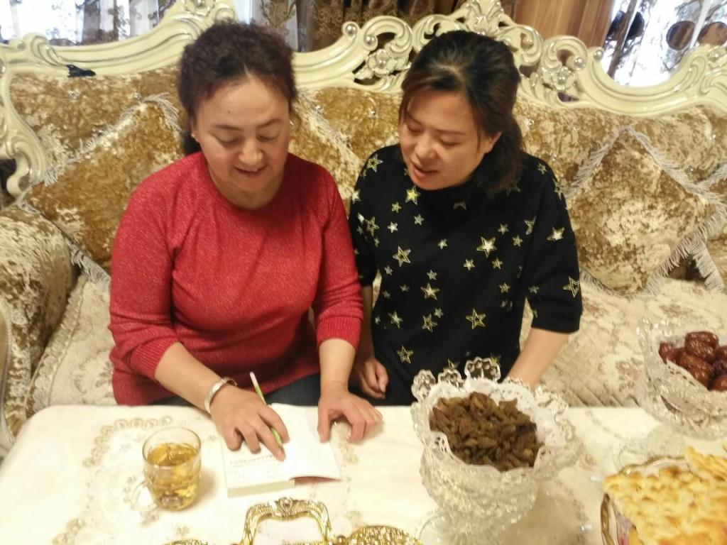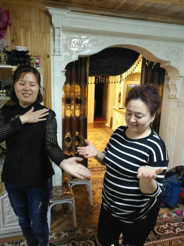 卡丽比奴儿是位亲和力很强的大姐,从岗位上退休后她的一些思想认识逐渐与社会脱节,又因为一般只与同族人交流,普通话说得不太好。阿不力孜主动邀请薛曲老师为卡丽比奴儿教授普通话,薛曲老师愉快地答应了。从此,每一次入住的时候,薛曲老师都要和卡丽比奴儿用国家通用语言进行耐心的沟通。效果是显著的,从一句话也无法沟通,到后来慢慢用国语、维语“夹生”的话比划着理解彼此的意思,再到现在日常简单交流已经不成问题了……在一起的生活越来越丰富多彩,大家在一起包包子,一起跳麦西莱普,一起聊美味糕点的制作,一起给孩子们讲故事、谈学习;薛曲老师还发挥校医的专业优势,为他们进行了简单的体检:量血压、测心率、进行健康饮食指导……
