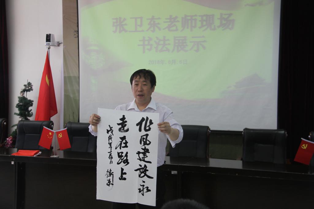会议上全体党员进重温了入党誓词,诵读了党章,进行了《党章》知识微答竞赛等严肃而有序的规定环节之后,王克同志结合作风建设内容上了一次党课——《锲而不舍抓好作风建设》,通过学习使全体党员进一步认识到作风建设永远在路上,要坚持抓常抓细抓长,抓好作风建设,为党旗增光添彩;最后,白碱滩区书法名师张卫东同志用毛笔现场书写“作风建设永远在路上”,这几个字苍劲有力,展示出了十九小学党支部抓好党的作风建设的决心。